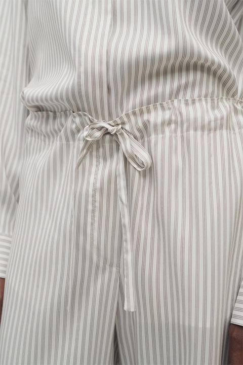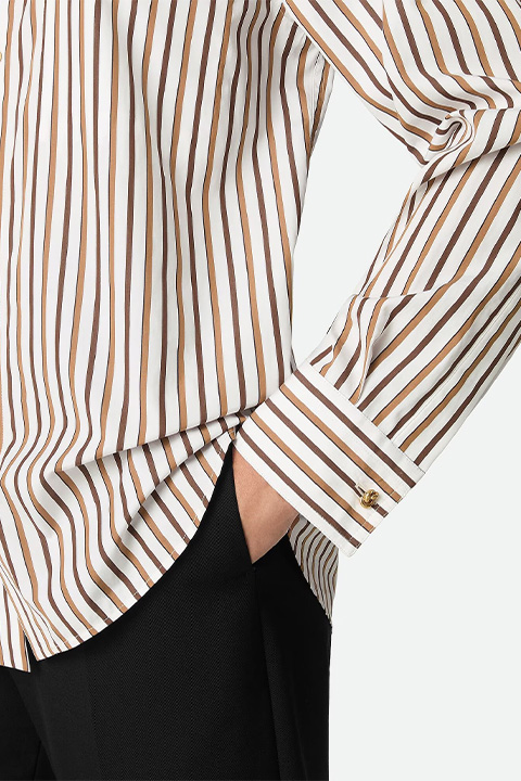 Bottega Veneta ise klasik çizgili gömleklerine, manşetlerdeki imza düğüm detayıyla sofistike ama minimalist bir dokunuş katıyor.